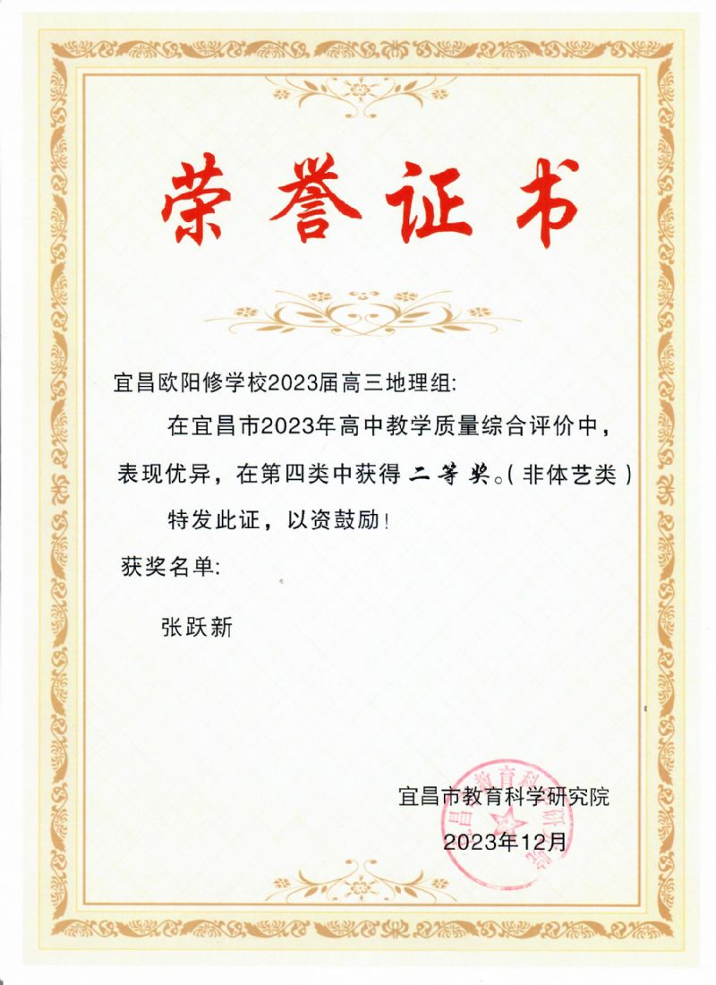 在宜昌市2023年高中教學(xué)質(zhì)量綜合評(píng)價(jià)中,我校高三地理教研組表現(xiàn)優(yōu)異,榮獲同類(lèi)學(xué)校二等獎(jiǎng)。